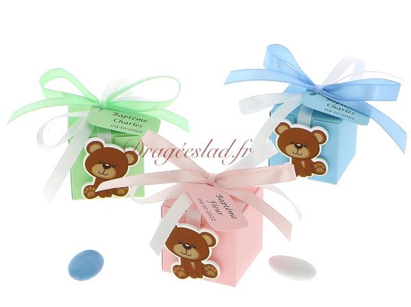Ballotin dragées cube aux couleurs douces décoré de son petit ours brun tout mignon. Boite à dragées garçon ou fille rempli de dragées amande et chocolat de fabrication française.