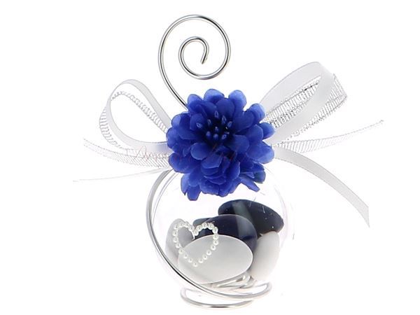 Boule dragées mariage transparente très classe décorée d'une jolie fleur bleu royal et garnie de dragées amande et chocolat haut de gamme Maison Pécou de Montauban. Le fil aluminium est travaillé de façon très original autour de la boule. Contenant dragées mariage original proposé à la vente en kit ou confection par nos soins.