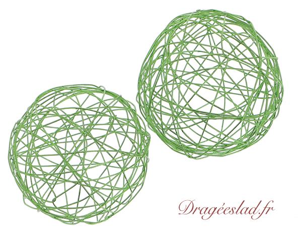 Contenant dragées très moderne. Laisser libre court à votre imagination. Décoration de mariage ou baptême superbement réussie avec nos boules dragées métal vert et leurs accessoires, ruban, fleur, papillon, perle, plume sans oublier les dragées.
