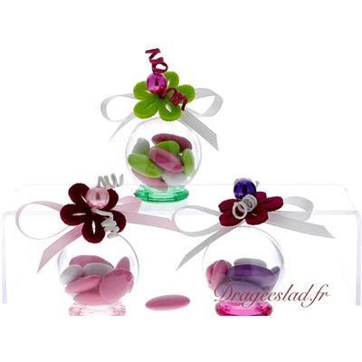 Fleurs feutrines et perles nacrées décorent avec bonheur nos boites à dragées sur le thème baptême Fleur et Perle.Très colorés, nos boules, éprouvettes ou sachets baptême fleur et perle feront la joie de vos invités. Contenant dragées baptême fleur et perle garni de dragées amande et chocolat haut de gamme à monter par le client ou livré fini. Pensez à garnir vos tables de coupelles de dragées (1 kg pour 30 personnes) pour le plus grand plaisir de vos invités. Nos boites à dragées baptême fille sont garnies uniquement avec des dragées de haute qualité de Fabrication Française de la MAISON PECOU. Une modification à apporter à nos ballotins dragées fleur et perle ? Contactez-nous !