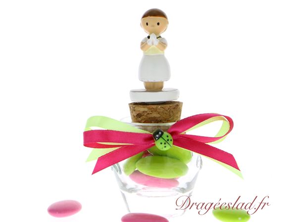 Pot jar décoré d'une communiante et d'une coccinelle garni de dragées amande et chocolat. Un très joli souvenir de communion à offrir à vos invités.